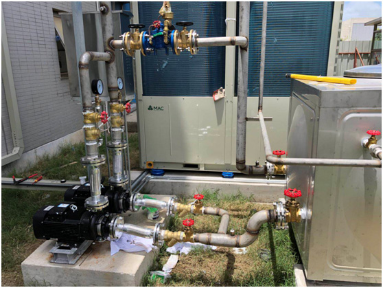 本項目中新設備選用麥克維爾風冷冷水機組加開式水箱系統,與原有系統相同,機主將水箱中水溫降低,再由水泵管道送至室內流水線中的冷凝器。