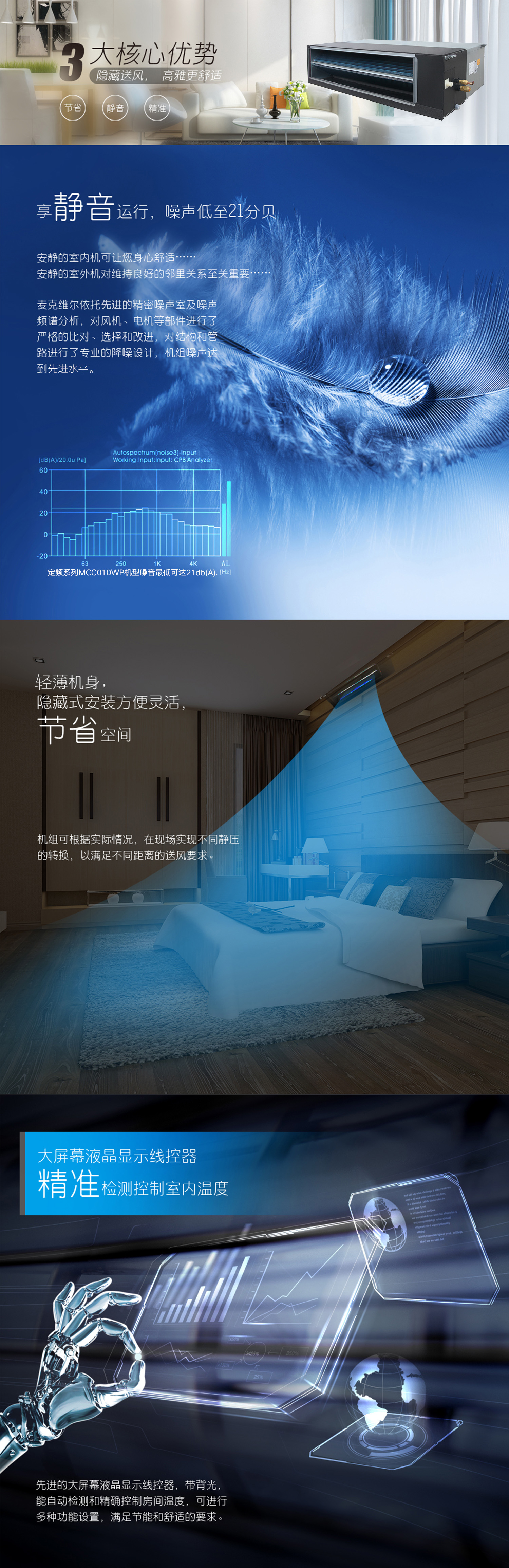 產(chǎn)品理念:采用變頻科技,讓機組時刻處于高效的工作狀態(tài)。應(yīng)用窄型結(jié)構(gòu)設(shè)計,大幅度節(jié)約安裝所用空間,可與各類裝修風格融合。依托于精密噪音實驗室和先進的多通道噪聲分析模擬軟件,通過結(jié)構(gòu)和控制邏輯的優(yōu)化創(chuàng)新,針對性的對室內(nèi)機噪聲源進行遏制和隔斷,打造安靜的室內(nèi)空間。